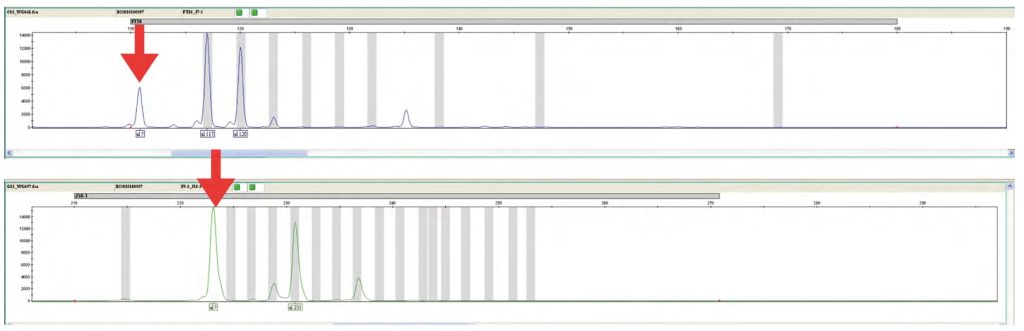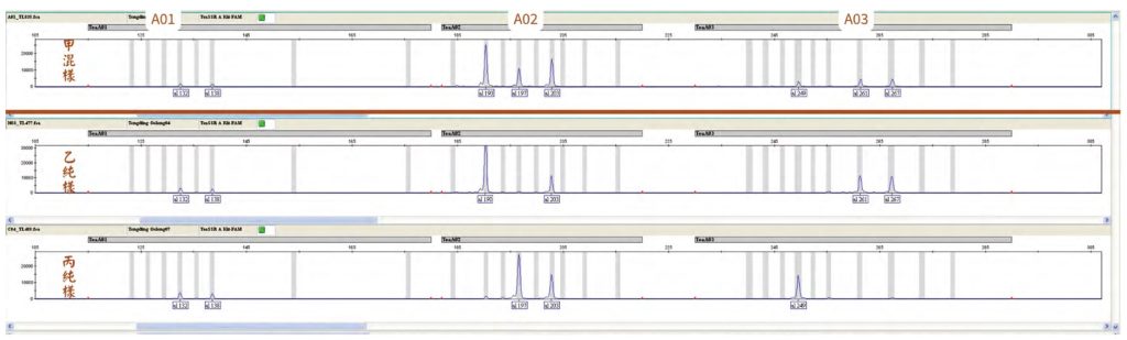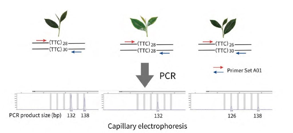 以下圖為例,圖中為3個外型相似的茶芽品種,由左至右依序為青心烏龍、四季春、青心大冇,在A01分子標誌的分析區域的簡單重複序列(SSRs)數量不同,致使三個品種的序列長度也會不同,因而成為鑑定依據。