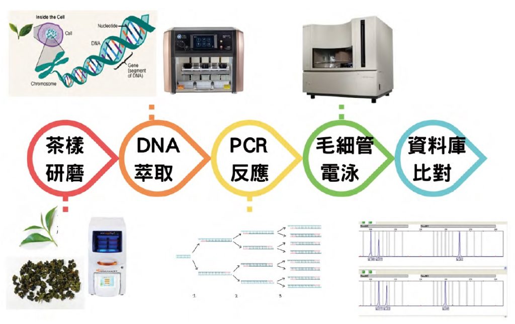 為穩定茶葉交易秩序與保障生產者與消費者權益,茶改場研發的茶葉DNA指紋鑑定技術,利用分子生物學原理,透過分析茶樹基因體中具特異性DNA序列多型性,識別茶葉品種及親緣關係。這項技術核心原理為:真核生物基因體中存在大量具變異性的短重複DNA序列,不同品種的序列長度不同,可透過聚合酶擴增反應(PCR)及毛細管電泳技術比對基因型,進而成為鑑別茶葉品種的依據。