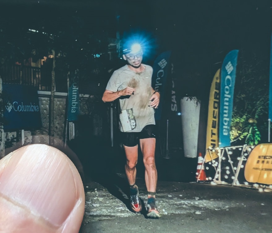 然後就在即將進站前,抽痛感默默消失,我又跑得動了,還來得及裝沒事,跑著進站讓攝影師捕捉身影。但我一身汙泥,號碼布破了一角垂在下擺,怎麼都裝不來。攝影師忍不住開口:「怎麼一副歷經風霜的樣子?」