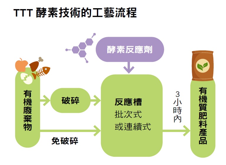 如何處理大量有機廢棄物的污染問題,已困擾全世界人類數千年,「TTT標靶酵素技術」是臺灣首創全球將有機廢棄物快速轉化為有機質肥料的技術,以3小時內的「酵素法」取代3個月的堆肥「微生物法」,目前已產業化邁向世界。農用三大類的肥料(有機質、化學及微生物)資材中,「有機質肥料的使用量」就是永續農業「土壤保育」及「合理化施肥績效」的主要指標,這項技術也可為人類所依賴的土壤做出貢獻,推動永續農業、循環經濟與實現2050年淨零排放目標。
