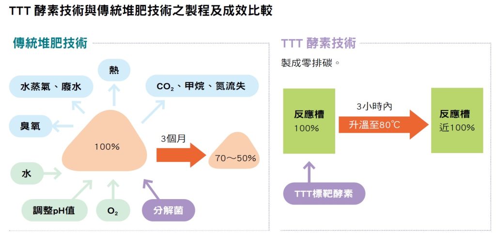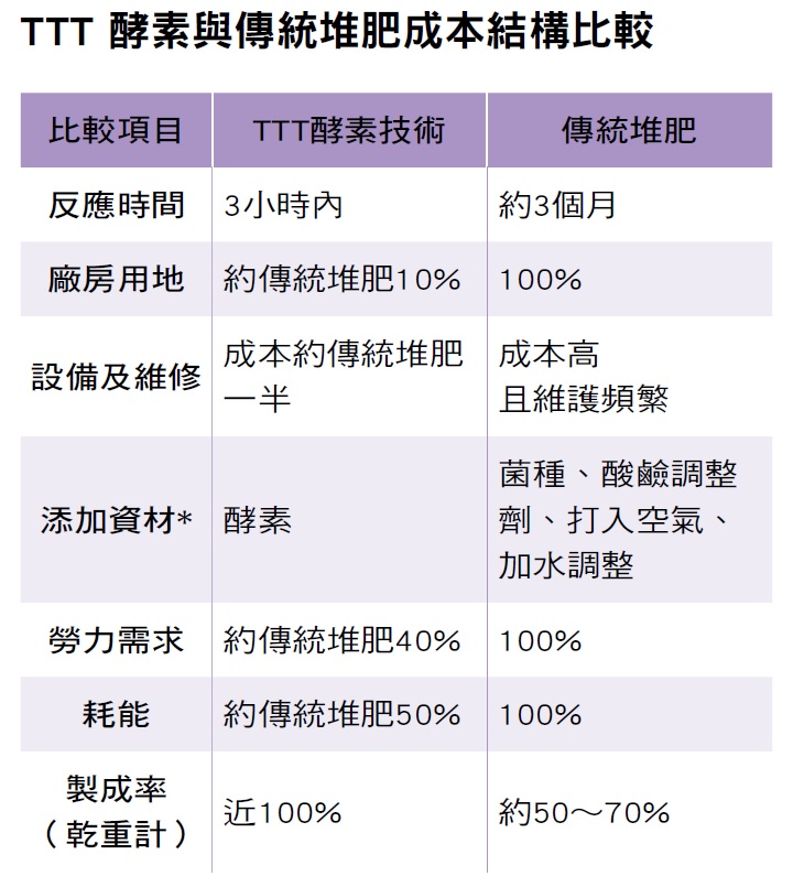 與傳統堆肥技術比較,TTT酵素技術能在3小時內取代傳統堆肥約3個月的製程,就如1年365天的工作時程縮短至半天,具有「時間就是金錢」的複利效應價值;TTT技術的製程也能避免傳統堆肥造成的臭味、廢水、甲烷等污染問題,也能避免碳及氮肥的損失。另外,傳統堆肥製成率約50~70%,而TTT技術製成率可達近100%(以乾重計),效率大幅提升。