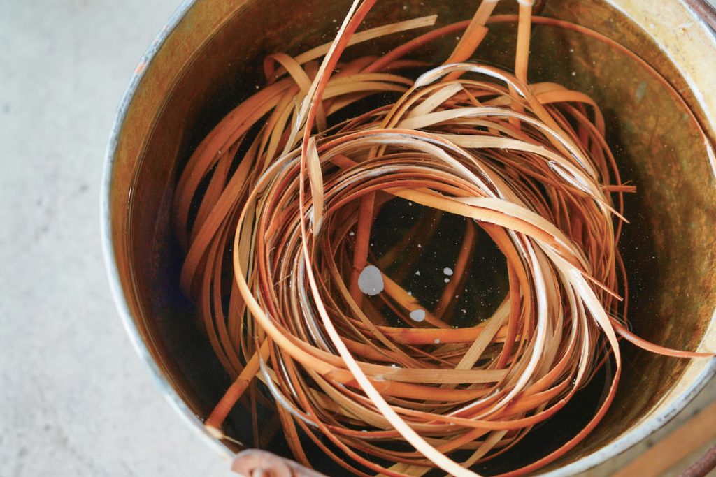 水桶內擺著細藤皮,竹片結構以細藤皮綑綁固定,不以釘槍代勞。