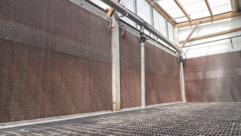 向天歌利用水簾(左)與風扇(右)控制鵝舍溫度,確保鵝隻舒適健康地生長在26~28℃之間。