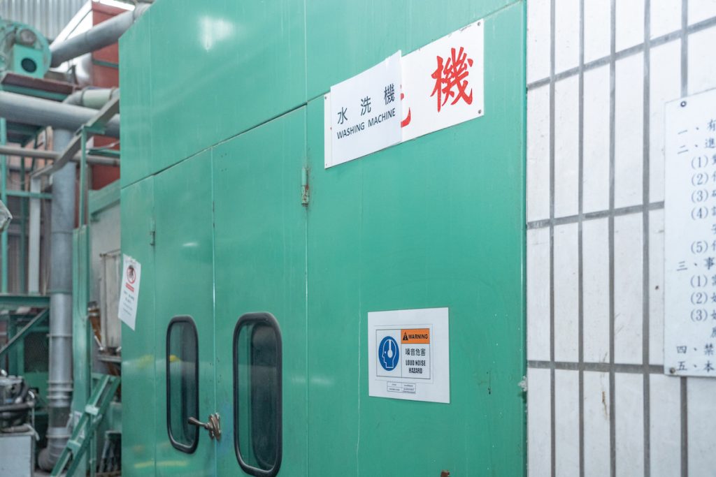 陳雅惠解說,鵝經屠宰後,處理沾滿血水的「水毛」是關鍵環節,必須在24小時內清洗,否則會腐爛。屠宰場回收來的「水毛」,經過水洗和烘乾及冷卻的程序,「就像洗衣機一樣」,再經過風力吹毛機,利用風力原理,初分出重量較重的羽和較輕的絨。「必須趕快收集、清洗,才能保持新鮮,」合隆等中游廠商接手後進行精洗,「粗洗的羽毛有濃重的油脂味,摸起來黏膩,精洗後幾乎無味,手感也不黏」。精洗包含12道工序,清潔劑去油、乾燥、冷卻、分級等,產出95%純度的鵝絨,蓬鬆度Fill Power可達700+,適合高端羽絨被與服飾。