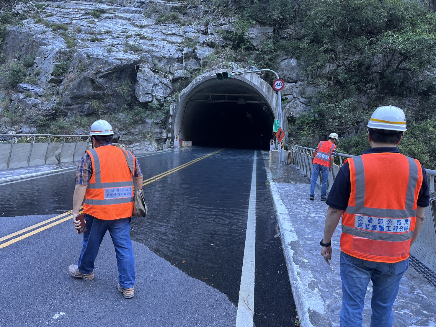 公路局東區養護工程分局CCTV影像顯示湖水溢流靳珩隧道。(圖片提供/林業保育署花蓮分署)