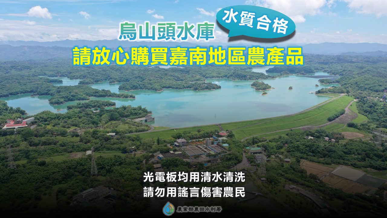 有媒體報導烏山頭水庫因光電板污染水質影響農作物安全,農業部農田水利署今(20)日表示,烏山頭水庫歷次水質檢測結果均完全符合灌溉水質標準,用水庫水源灌溉出來的農作物安全無虞,請民眾放心購買,並請有心人士停止用烏山頭水庫水質遭污染等謠言來傷害農民。