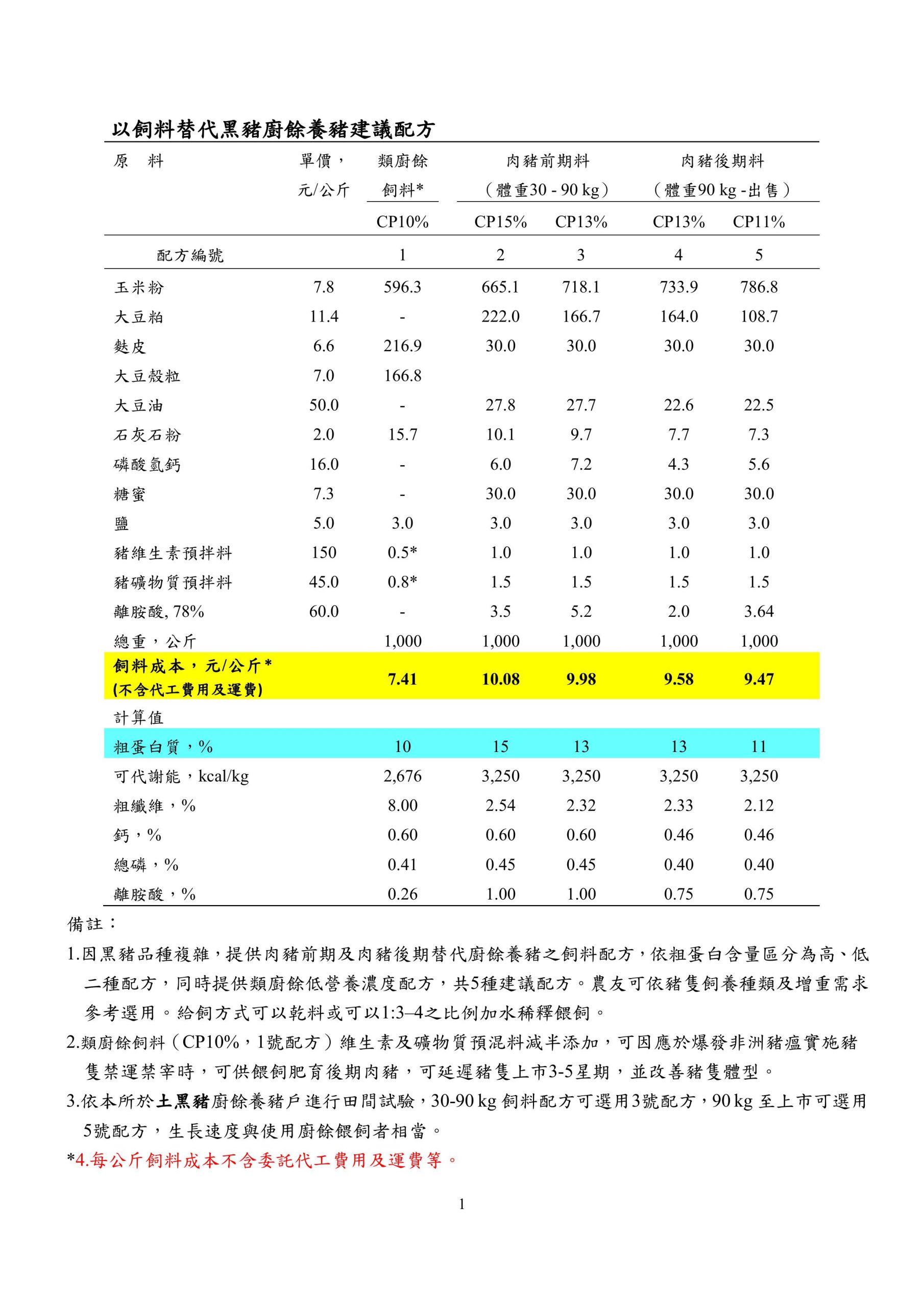 畜試所根據國內大黑豬及土黑豬的生長期與肥育期的營養需求,設計符合新版國家飼料標準的飼料配方,以及低營養濃度的「類廚餘」飼料配方,依粗蛋白(CP)比例高低分為5種配方,供豬農依據豬場需求替代使用;肉豬體重30至90公斤生長肥育前期選用2、3號的CP15%、CP13%配方,90公斤以上生長肥育後期選用4、5號的CP13%、CP11%配方。