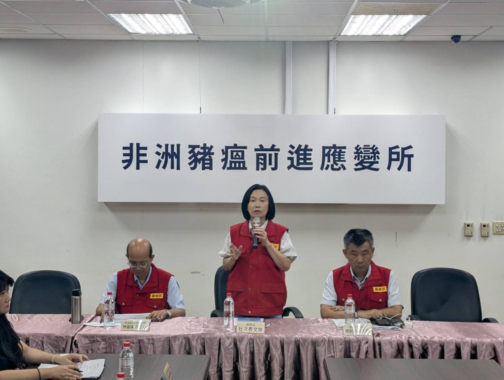 非洲豬瘟中央災害應變中心為積極處理臺中疑似非洲豬瘟案例各項防疫處置工作,22日於農業部動植物防疫檢疫署臺中分署成立前進應變所,由農業部次長杜文珍擔任指揮官。前進應變所今(23)日舉辦首次說明記者會,針對外界關心檢出非洲豬瘟陽性案例場13日已出豬28頭流向,杜文珍表示,豬隻去到屠宰場要有健康證明;屠宰前要屠前檢查;進到屠宰場獸醫師會做屠宰衛生檢查,有不合格要判定廢棄,不能送到市場,因「三層把關都是安全的,上市是無虞的」。