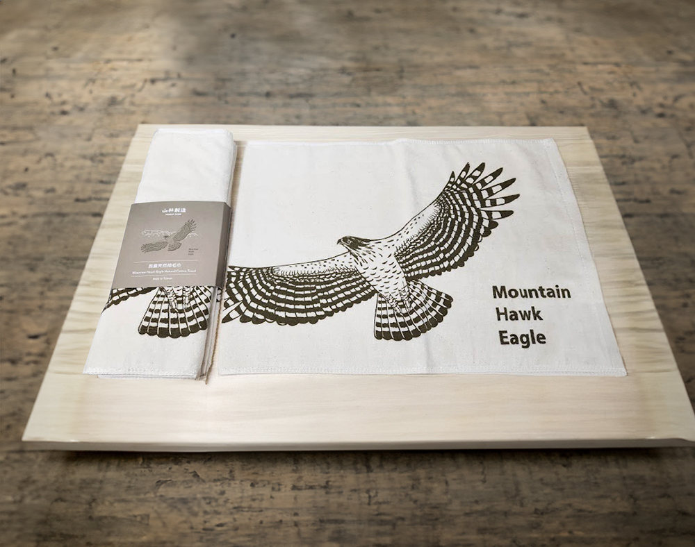 以飛翔的熊鷹結合圖騰設計製作的有機棉毛巾。(圖片提供/林業保育署)