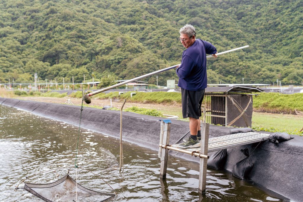 在宜蘭縣蘇澳鎮水產養殖產銷班第一班班長黃孟濱的介紹下,目前擔任丸大水產專業經理人、並著有《草蝦繁、養殖實務操作手冊》的林文士走向一座直徑約30公尺的圓形養殖塑膠池。一路上,他邊走邊說明日常作業流程:「我每天會餵6餐,第1餐從早上5點半開始。測水溫分別在早上6點和下午2點,抓蝦則看蝦販來的時間,可能是晚上6 、7點,也可能半夜2點。」林文士表示,若養殖過程中發現水質偏酸,會撒石灰來調整酸鹼值;而對於水質防疫的管理,則常使用光合菌與枯草桿菌,幫助淨化水質與底質環境。他隨手拿起一旁的塑膠盆,將太子牌斑節蝦飼料倒入自動飼料機中。隨著人口老化、人工難尋,機械化成了產業的必備幫手——透過自動化設定,可控制投餌量與投餌半徑,不僅穩定飼養條件,也大幅減少人力成本與工作人員的體力消耗。
