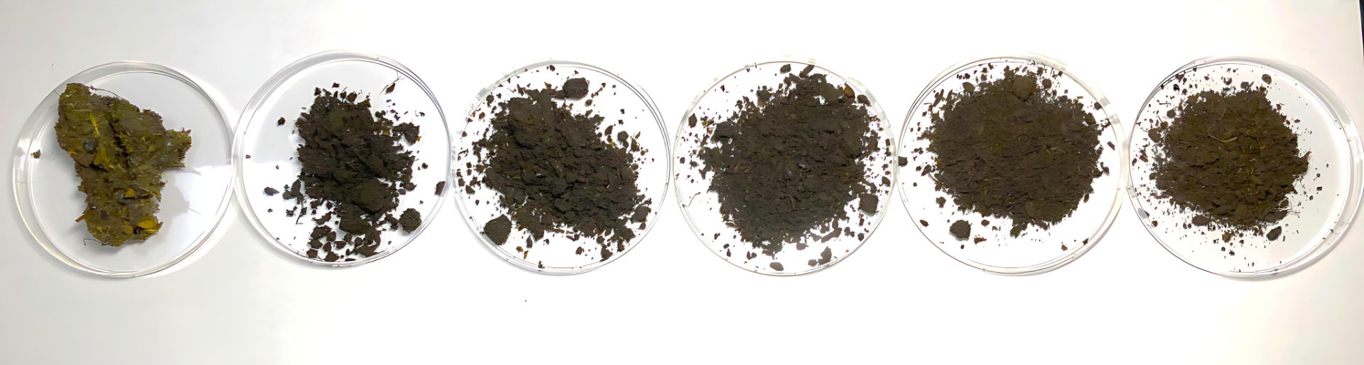 不同腐熟度的雞糞肥樣品。樣品愈往右腐熟天數愈久,質地愈鬆散,顏色呈現棕褐色。(圖片提供/畜產試驗所)