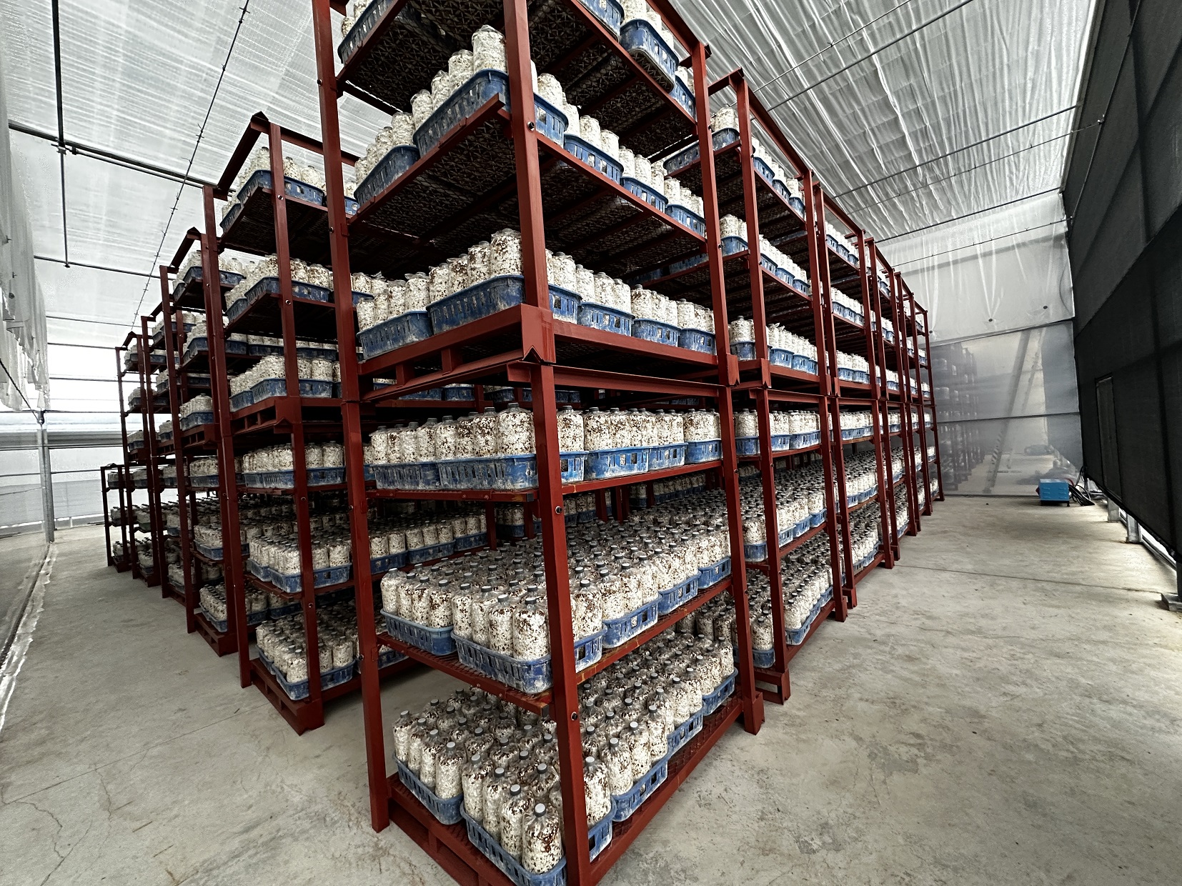 班長劉啟葦表示,極端氣候下,傳統菇寮栽培面臨低溫、熱障礙等挑戰,因此希望藉由環控菇舍穩定生產,他的立體化栽培菇舍單位面積產量是傳統菇寮4倍,每分地可收穫1.2萬公斤鮮重香菇,且相較傳統菇寮一年一收,環控菇舍一年可3至4收,總產量可達傳統菇舍12倍。