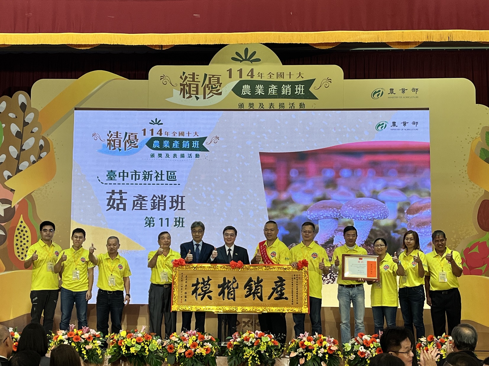 行政院長卓榮泰親頒獎項給臺中市新社區菇產銷班第11班。(攝影/游昇俯)