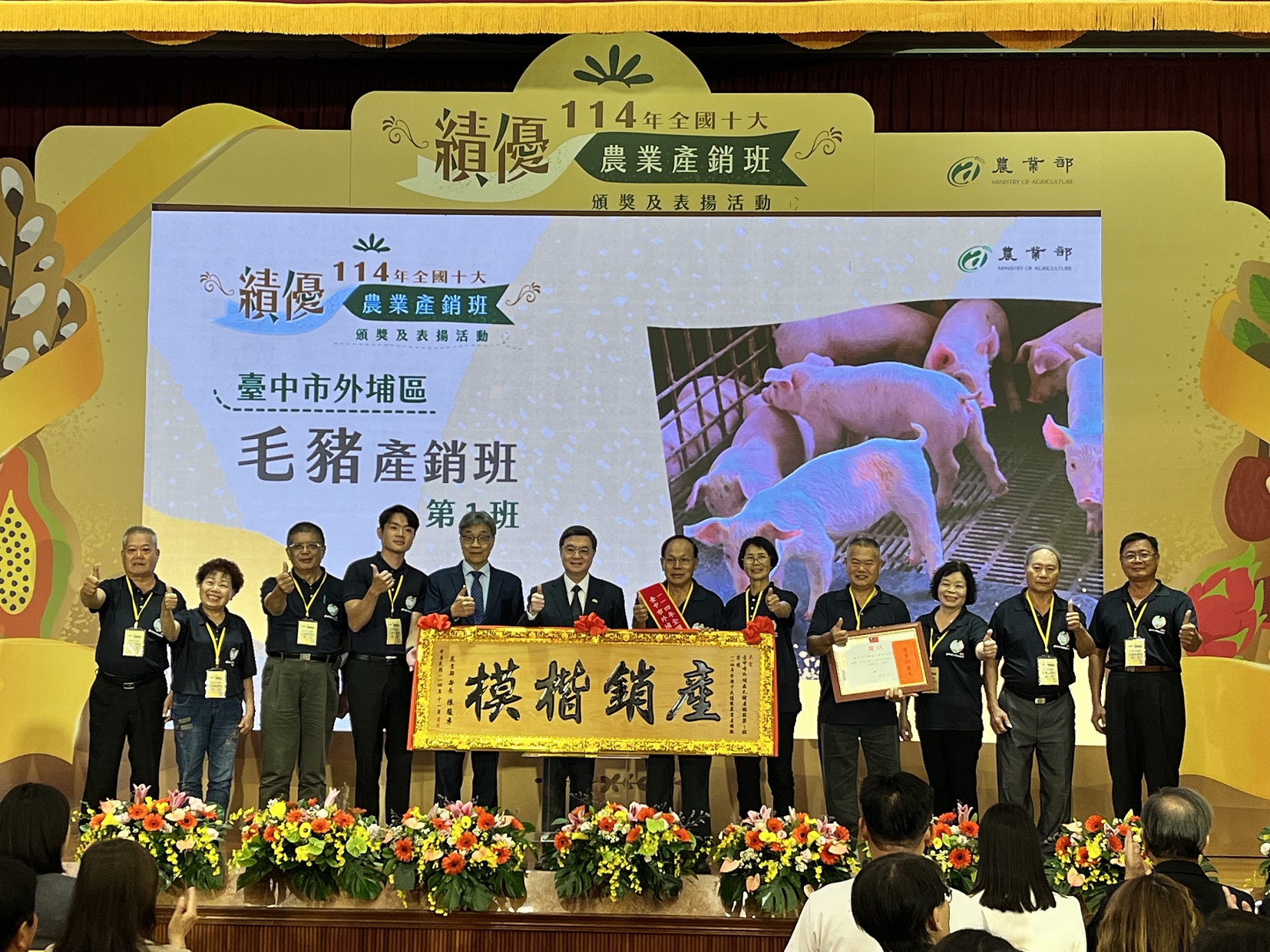 臺中市外埔區毛豬產銷班第1班獲行政院長卓榮泰親頒獎項。(攝影/游昇俯)