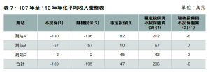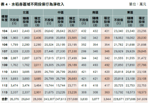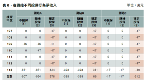 以中區模擬資料為例(如表4),未發生重大災害的正常年度,如104年、107年至111年,穩定投保者相較於不投保農民每年需支出保費約116萬元,因此在這段期間內,不投保者的整體淨收入略高。然而在災損最嚴重的112年,不投保者淨收入15,744萬元,較111年之26,799萬元減少11,055萬元(此損失金額相當於可支付約95年的保費),穩定投保者2年度淨收入相比僅減少2,912萬元。由表1可看出,即使經過重大災害年度,穩定投保者在各區域中淨收入皆高過於隨機投保與不投保者,展現保險制度在重大風險發生時,有效穩定農民收入的保障功能。
