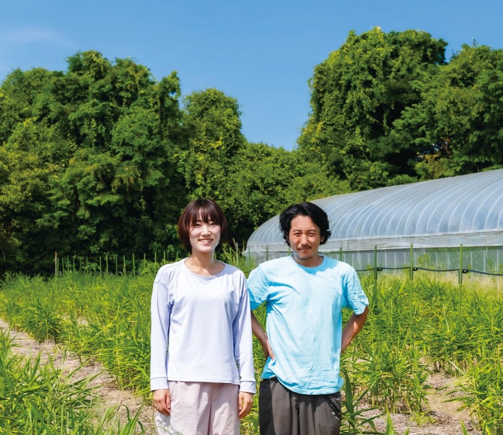 與高倉農園約定採訪的時間是正值盛夏的糸島,10點鐘過後,頭頂上炙烈的太陽早已將空氣曬得悶悶熱熱。隨著農園女主人高倉由紀子駕駛的鮮紅色鈴木小吉普車繞來繞去來到農園的生薑田。田裡的生薑苗被包圍在人工種植的矮樹叢間,一畦畦生薑的葉片在熱風裡搖晃,青翠中帶著一點辛辣的氣息。