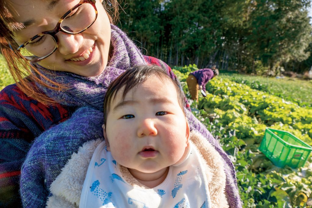 在農園裡,我看到由紀子懷裡抱著剛出生幾個月的孩子,笑容溫柔而堅定,背後的雅昭依舊彎著腰,專注地在田裡收成。農園的勞動與育兒的日常,開始緊密地交織在一起。
