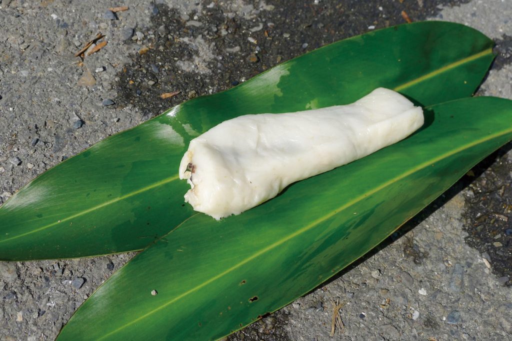 可食葉片的最外層,會巧妙地利用五節芒(Miscanthus floridulus )的葉片,將吉拿富綑綁紮實。五節芒在部落生活中用途廣泛,不僅用於狩獵的標記與火把,作為木屋或獵寮的屋頂鋪材,在祭儀中亦扮演重要角色,其易於取得與厚韌的葉片特性,使其成為捆綁美食的理想材料。除了五節芒,最外層的包裹葉片,也可能是月桃(Alpinia zerumbet)、克蘭樹(Kleinhovia hospita)或是血桐(Macaranga tanarius),信手拈來,這種就地取材、多功能利用的智慧,是排灣和魯凱族與自然環境和諧共處的最佳寫照。