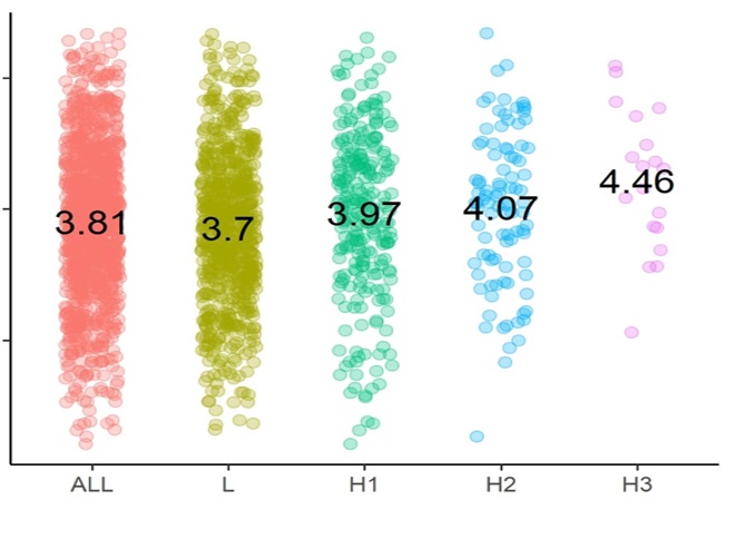 1,080頭商用肉豬里肌肉樣本的肌內脂肪含量平均為3.81%,3個「基因標記組合」均呈現有助生成油花時(H3),肌內脂肪含量平均可達4.46%;反之、「基因標記組合」呈現不利油花生成時(L),肌內脂肪含量平均僅3.7%。(圖片提供/畜試所)