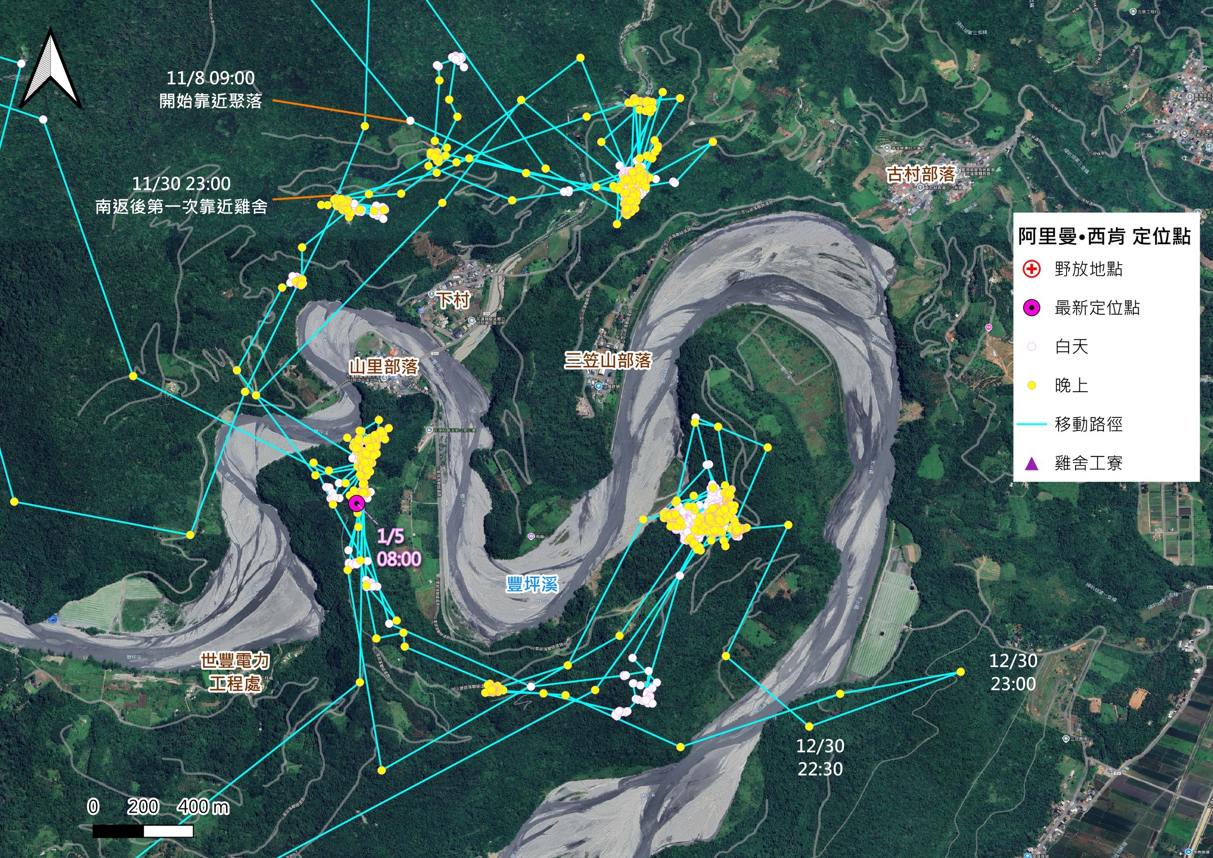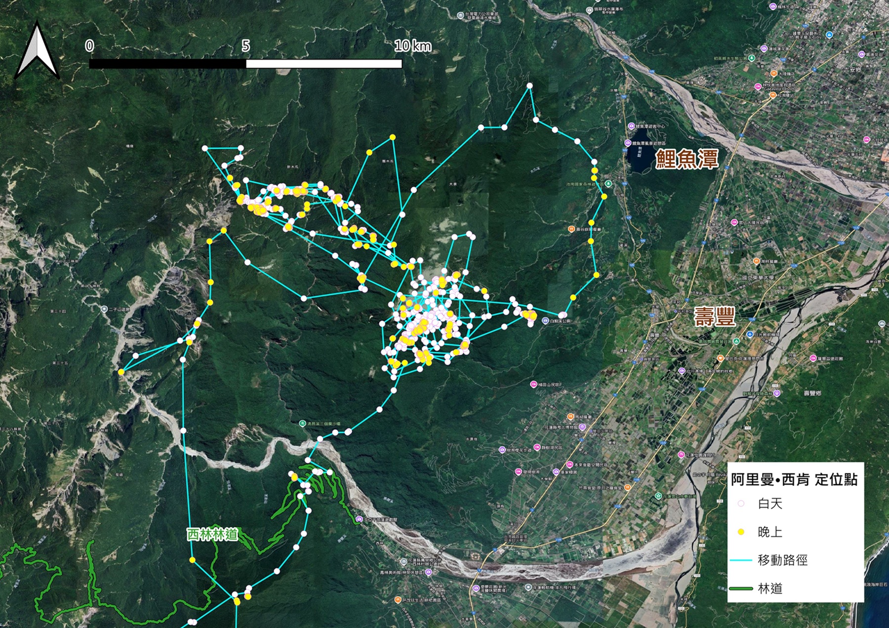 阿里曼‧西肯去年9月起開始接近人類活動區域,10月26日一度接近池南森林遊樂區及鯉魚潭周邊。(圖片提供/林業保育署花蓮分署)