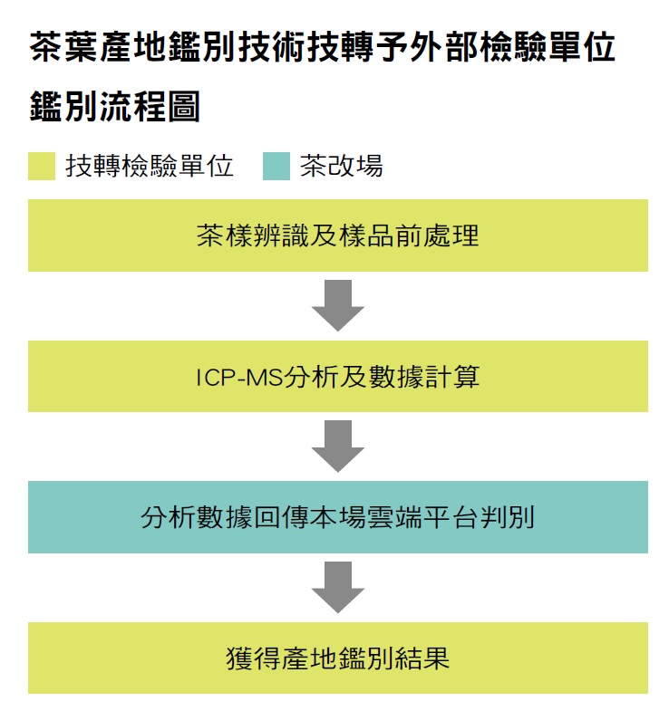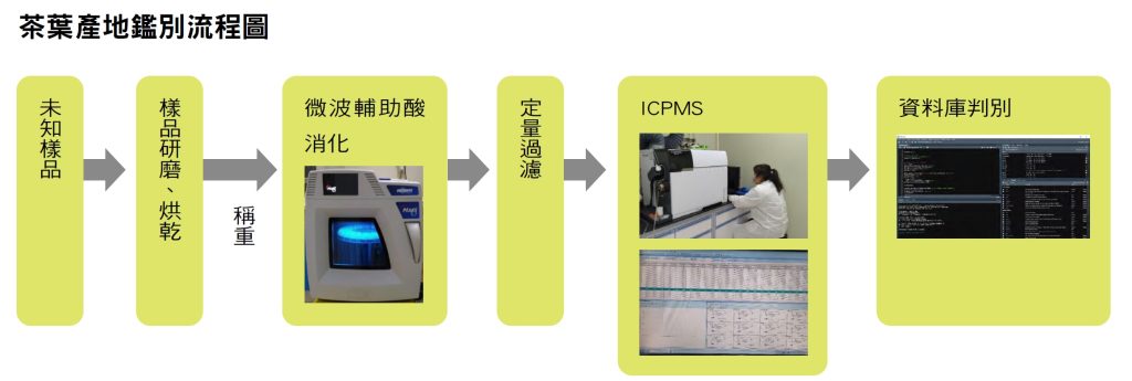 為捕捉這些獨特的「地理指紋」,茶改場採用感應耦合電漿質譜儀(Inductively Coupled Plasma Mass Spectrometry, ICP-MS)與統計分析技術發展出鑑別方法——「茶葉中多重元素檢驗方法」(TFDAF0032.00)。這項鑑別方法能夠對烏龍茶茶葉中的多種微量元素進行高靈敏度、高精準度的定量分析,再以統計方法進行產地區別。整個鑑別流程大致如下: