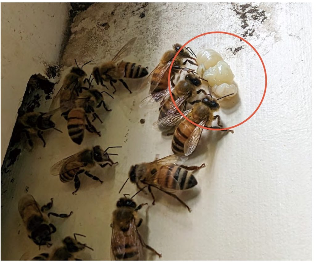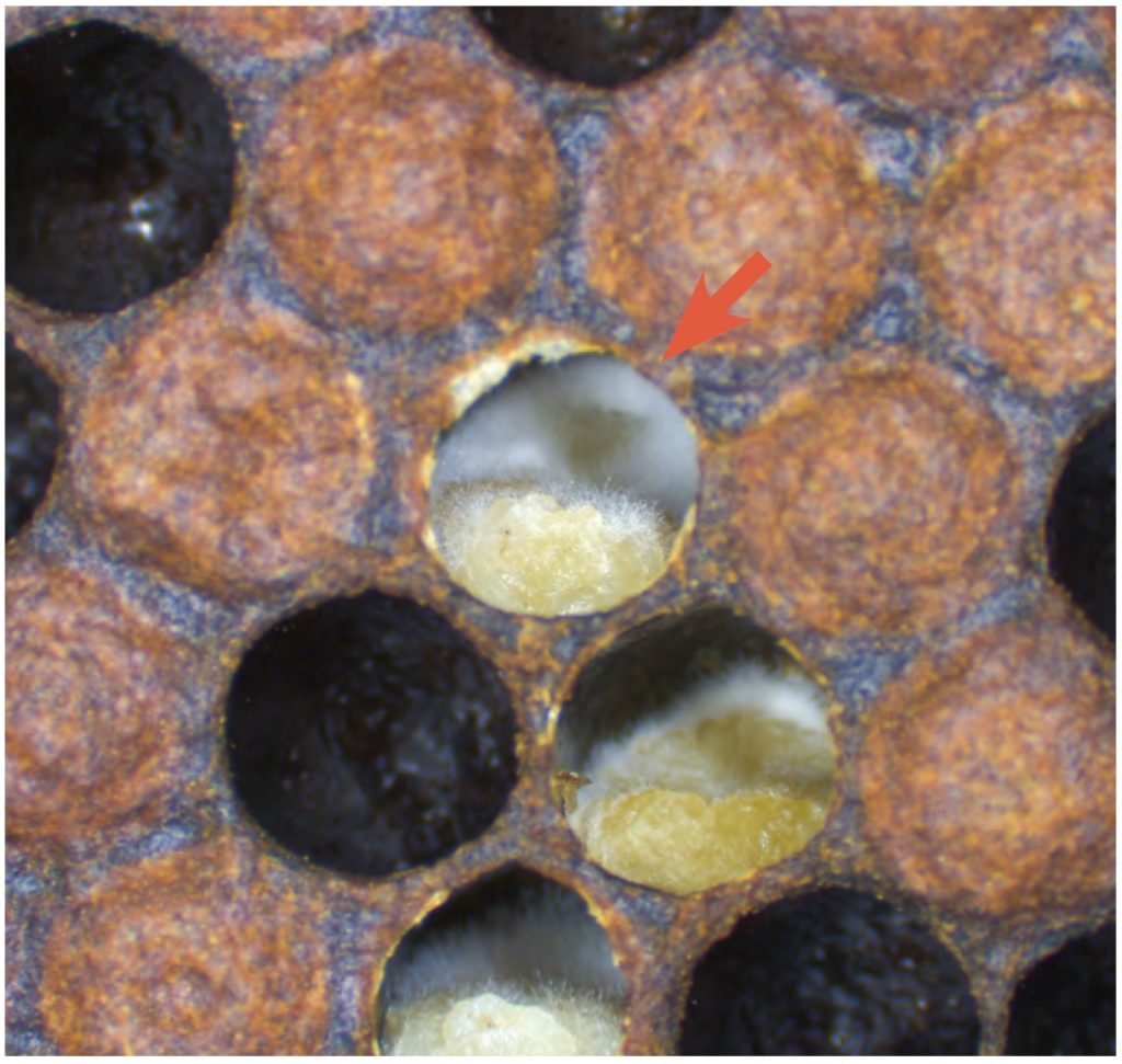 為了進一步驗證蜂群的耐病力,研究團隊選定對蜜蜂幼蟲與蛹危害甚鉅的真菌性病害「白堊病」,作為耐病力評估的重要指標。白堊病是由球囊病菌(Ascosphaera apis)引起,會導致蜂群幼蟲與蛹變成堅硬、白色如木乃伊般的屍體,嚴重時會造成蜂群的大量死亡。