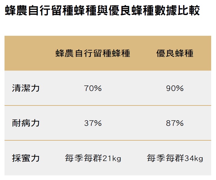 最終的育種結果顯示,改良蜂種的採蜜力平均每群蜂每季產蜜量可達34公斤,遠高於蜂農自行留種蜂種的21公斤。這不僅直接提升蜂農的收益,也為臺灣蜂蜜產業的產量提供穩定的基礎。
