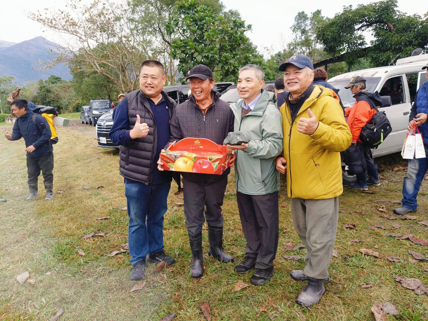 花蓮分署分署長黃群策為感謝施工團隊辛勞,冒險完成這項艱鉅任務,特別前往大農大富森林園區迎接返回人員,並贈送蘋果、表達「平平安安」歸來之意。