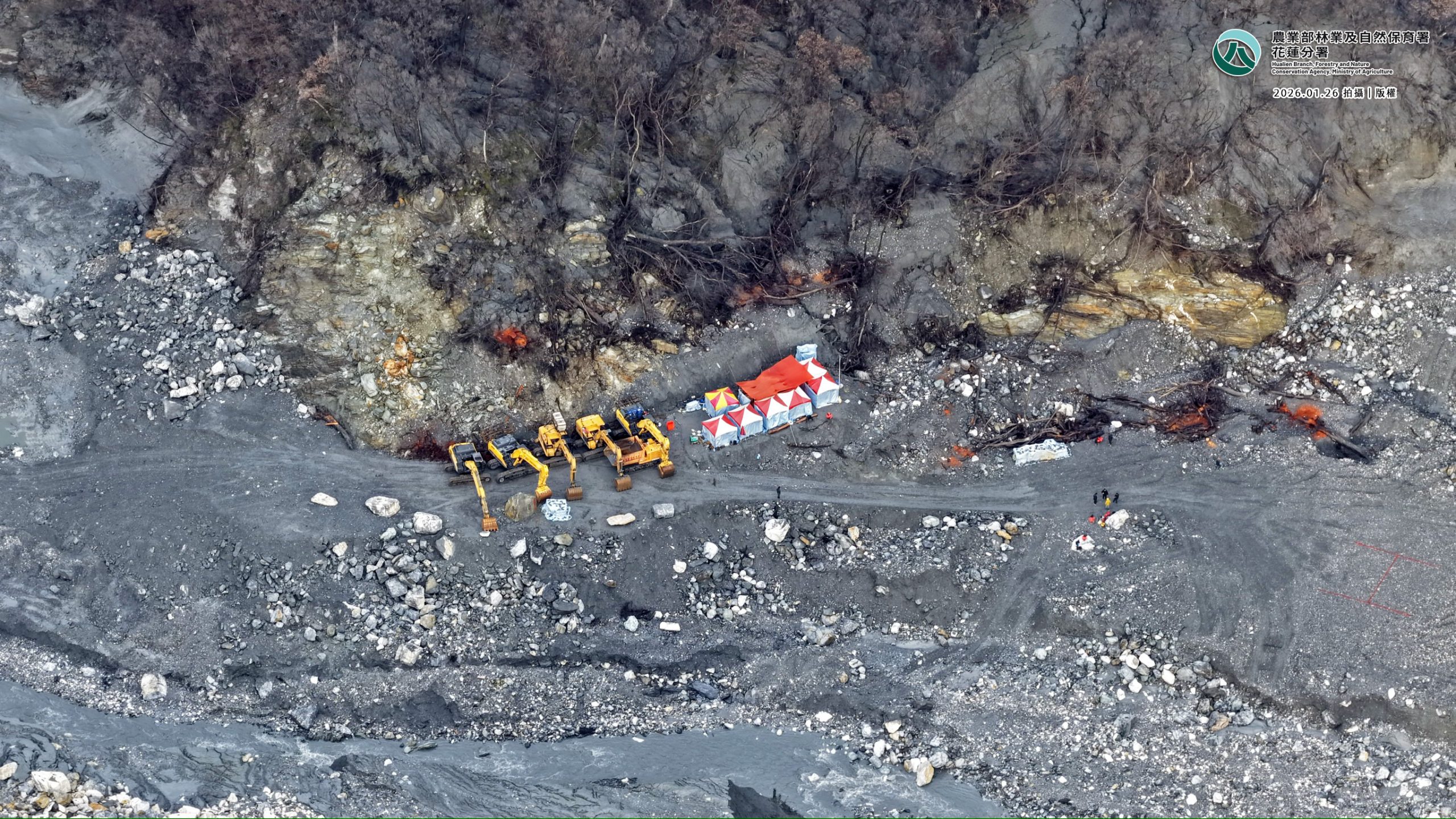 花蓮分署表示,因山上崩積土砂仍具坍塌崩落潛勢,施工人員原規劃下撤路線,在1月11日距離溢流口下游1.5公里的V型河谷上邊坡發生大約18公頃的大量土石崩坍,滑落土體擠壓河道造成河道束縮,影響施工人員下撤安全。安全考量下,經內政部空勤總隊協助,今日早上透過空勤直升機將施工團隊14人平安送返平地,所有施工機具仍暫時留置堰塞湖壩區現場,以備日後不時之需。