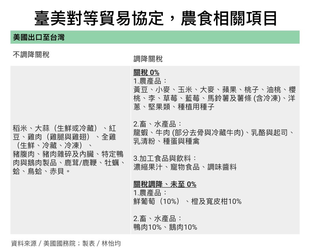 今(13)日,臺灣與美國簽署「臺美對等貿易協定」,協定結果有臺灣 261 項農產品輸美免關稅,例如:蝴蝶蘭、鳳梨、芒果等;美國農產品輸台調降關稅者有大宗物資黃小玉、蔬果如葡萄、櫻桃、柑橘、洋蔥和馬鈴薯,美豬關稅將於 3 年內減半,美牛則開放絞肉及心肝腎。針對美豬美牛亦有非關稅調整措施,例如:萊克多巴胺殘留標準比照Codex。