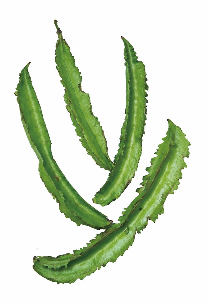 果莢有四邊稜狀突起與酷似羽狀皺摺,也俗稱羊角豆。臺灣東部較多,採收果莢作為蔬菜用。