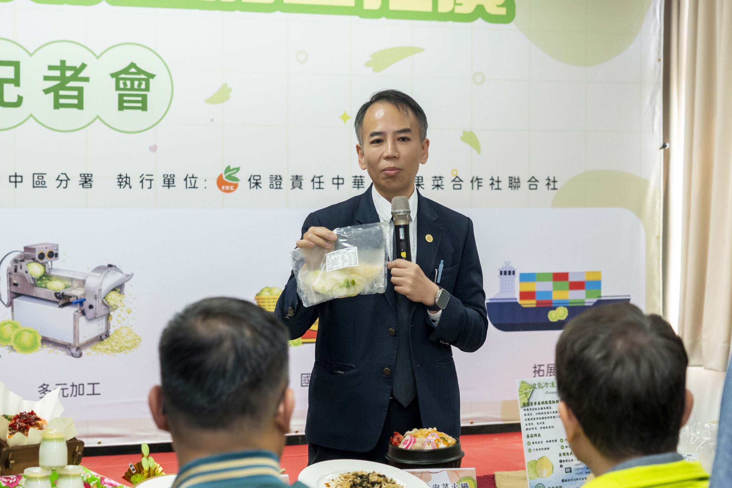 宜蘭大學副校長謝昌衛介紹運用液態氮技術所開發的冷凍高麗菜產品。(圖片提供/農糧署)