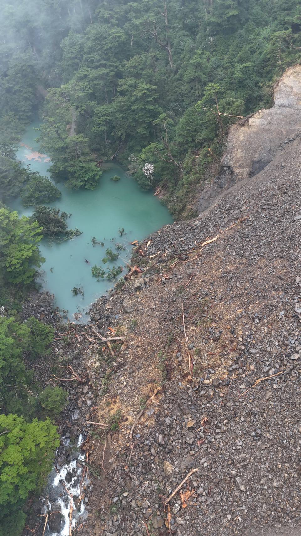 受到清明連假期間豪雨影響,農業部林業及自然保育署臺中分署轄內大甲溪事業區第82林班(合歡溪步道約3.5公里處)發生邊坡崩塌,形成新生堰塞湖。臺中分署今(8)日表示,因現地持續降雨起霧,無法全面空拍,初步評估堰塞湖蓄水量約6萬公噸,崩塌處下游兩岸尚無急迫須保全對象,但仍呼籲附近華岡居民及登山民眾,暫勿進入溪床及崩塌區域活動,以策安全。