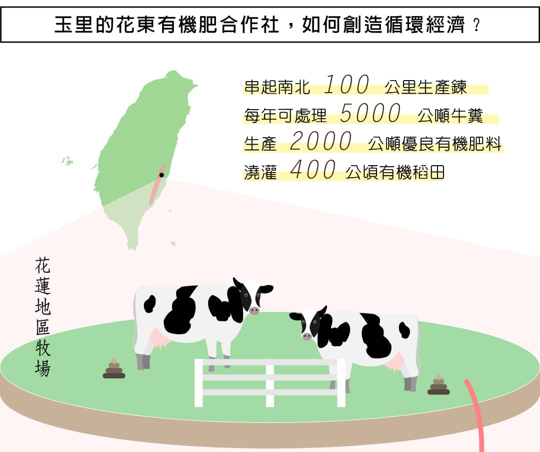 位在中央山脈東側的花蓮,自古因地形限制,東西往來得翻過好幾個山頭,許多農業資材硬生生比西部貴,然而這樣的天生劣勢,反而促使當地人更有效運用手頭資源,位在花蓮的東豐拾穗農場便是其中的典範,難處理的動物糞在堆肥廠發酵後,成為澆灌稻米最好的養分;脫殼後的粗糠、米糠,再一次回饋大地。以花東中心玉里為基點,南北開拓出100公里長的生產鍊,創造出生生不息的循環經濟。