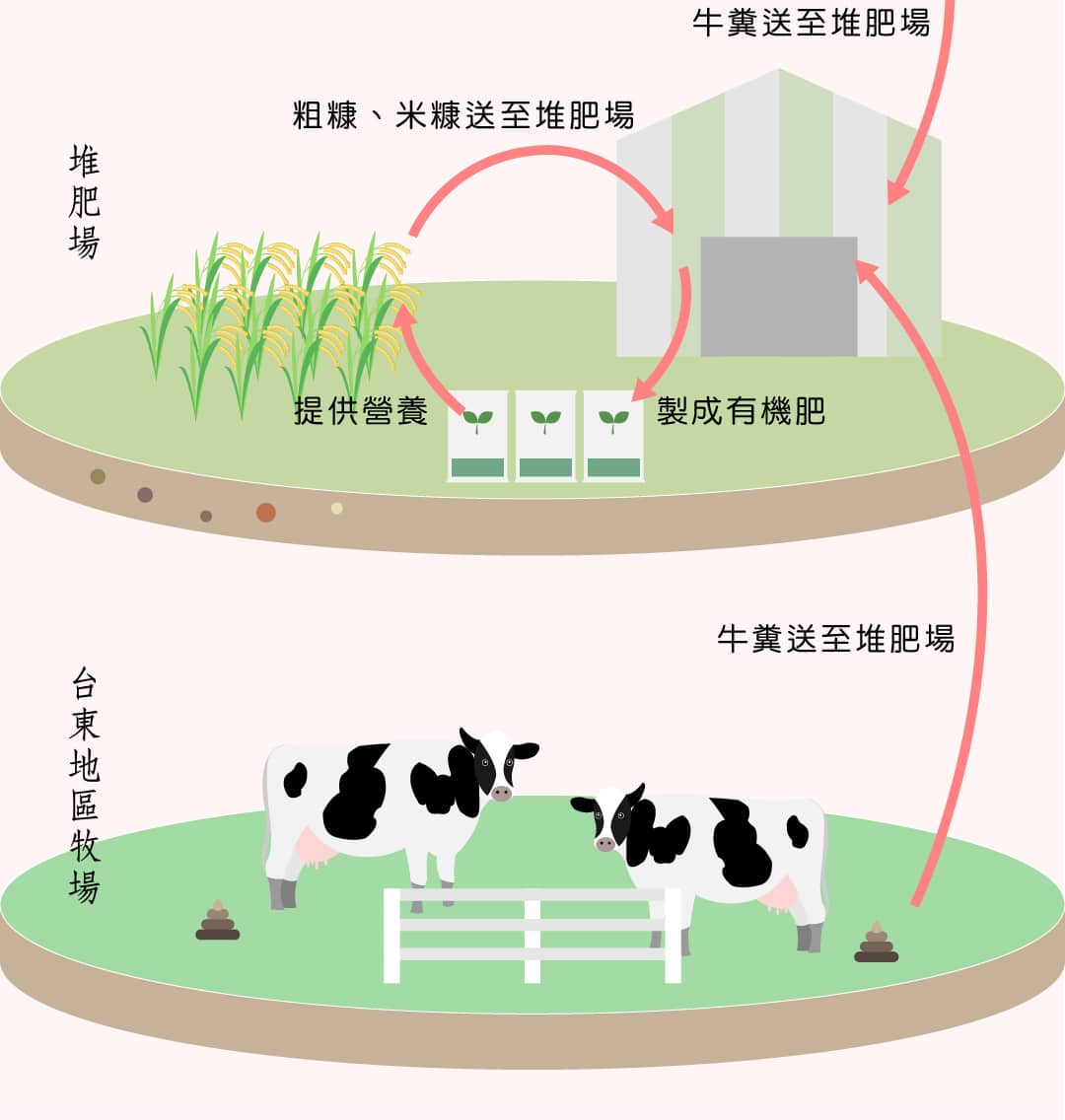 東部少汙染的環境,造就蓬勃的酪農業,玉里往北有瑞穗牧場,南邊是初鹿牧場,一般人眼中棘手的動物糞便,經過發酵後就是天然堆肥中的精華,由於豬和雞吃的東西比較複雜,糞便容易殘留鋅和銅,牛吃的飼料相對單純,因此曾國旗選用牛糞當堆肥,和10幾家固定農戶配合,所有動物糞便都必須採樣,檢驗八大重金屬,確保安全無虞後才能做堆肥。