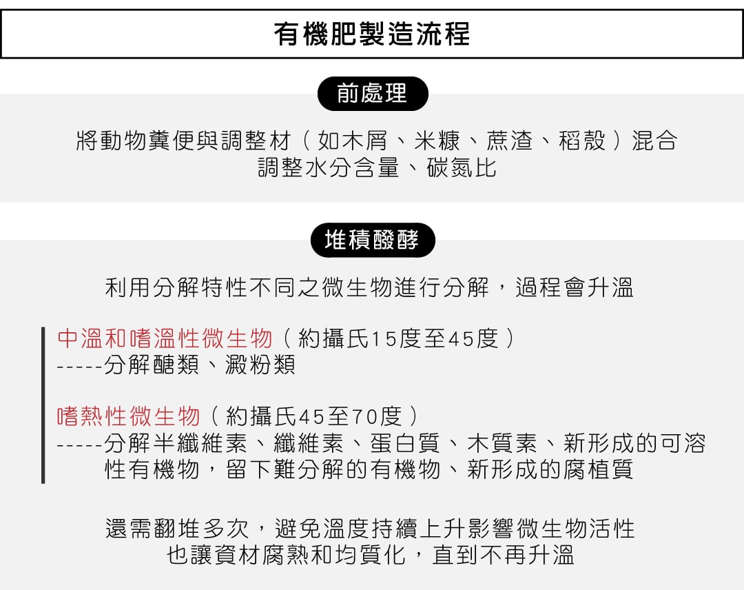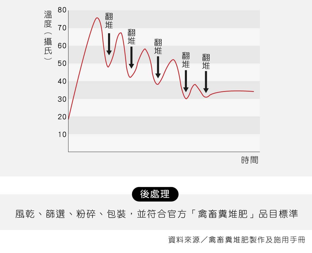 但做堆肥可不是把原料全都丟進去,發酵時間、溫度、菌種等等,都會影響肥料最終的有機質含量,他解釋,堆肥前期發酵溫度大約在40-50度C,中期一定要升溫到70度,因為原料中有很多雜物,例如蒼蠅卵、種子、病菌等,都需經充分發酵才能殺菌、留下需要的有機質。