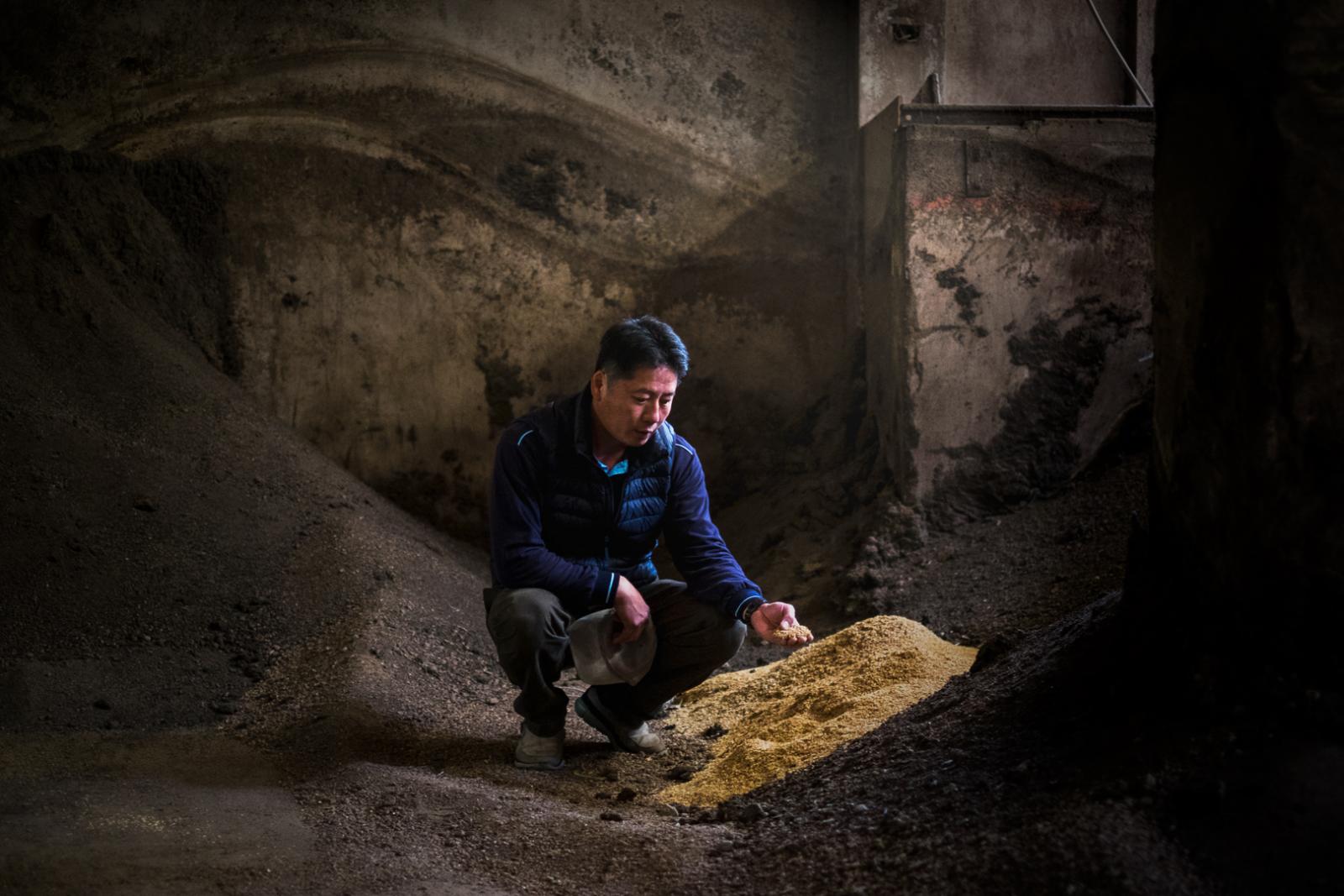 走進發酵室,咖啡色、淺褐色、金黃色交錯的堆肥小山中,夾雜著幾根碾碎的麥桿,曾國旗隨手抓起一把土說,「這是前幾天小麥收割後不要的麥桿,直接送進來做堆肥。」
