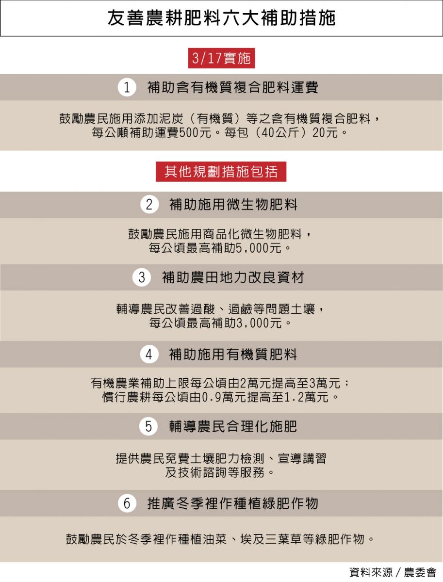 例如,慣行農耕有機質肥料規劃加碼補助上限從每公頃由9千元提高至1.2萬元,微生物肥料規劃每公頃最高補助5千元,農田地力改良資材規劃每公頃最高補助3千元等,及後續推廣冬季種植綠肥作物,幫助農民穩定農產收益,以全方位友善農耕肥料補助措施,循環利用各項資源。