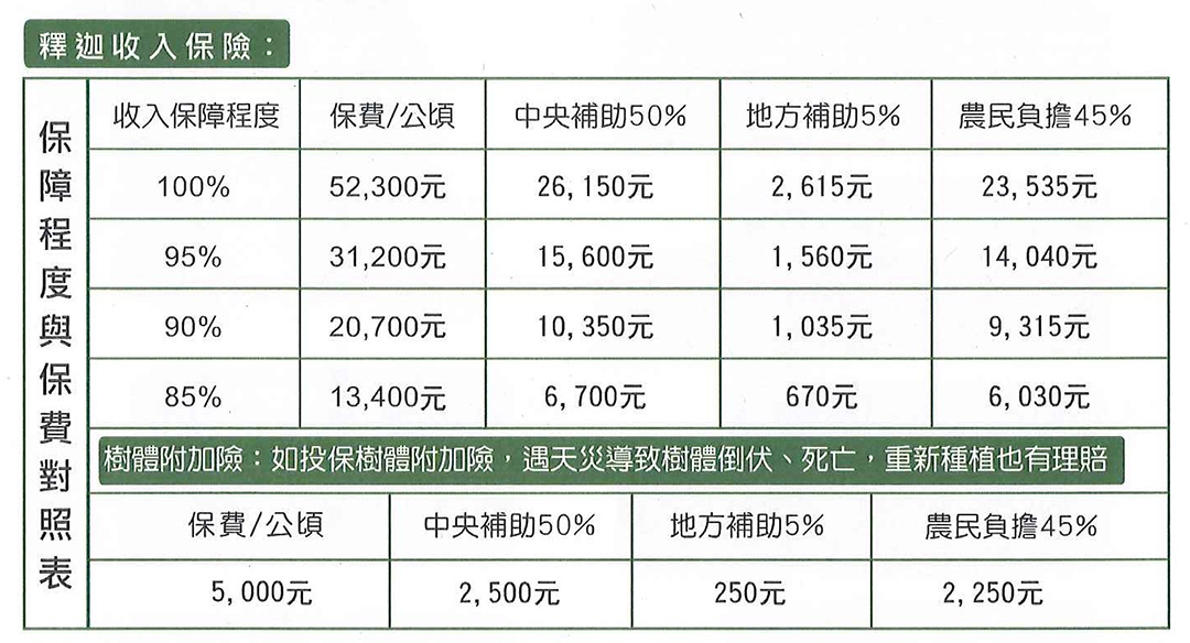 為鼓勵農民藉由保險機制穩定收入,分散災害風險,投保釋迦收入保險的農民,農委會農糧署將對用地合法之保戶,補助二分之一保險費,另由臺東縣政府,補助百分之五保險費。