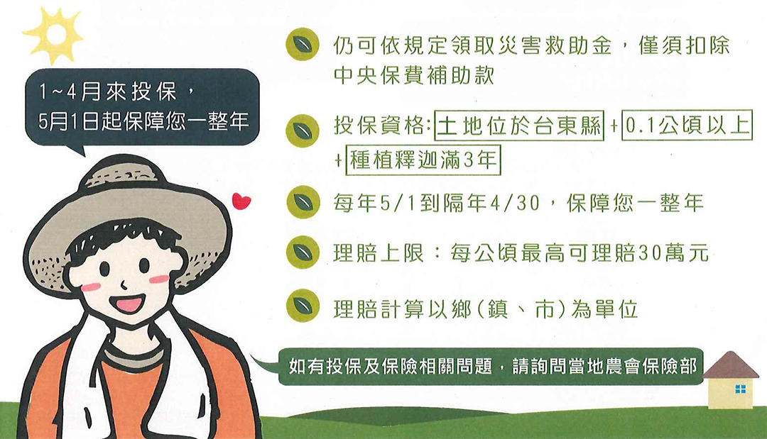因氣候環境劇烈變遷,天然災害頻仍,農委會於104年起積極推動農業保險,除梨、芒果之商業保險陸續開辦外,今(106)年起在臺東地區開辦釋迦收入保險,投保期限自4月1日起至4月30日止。有意願投保之農民,可就近向當地農會保險部門詢問,並索取投保宣導單張,說明投保相關規定及理賠範例等疑問,或至農委會農糧署網站查詢。