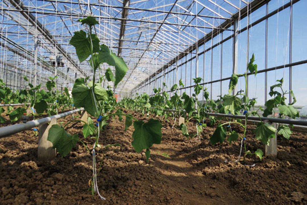 網室中成排的小胡瓜幼苗,整齊地以線支撐其生長。
