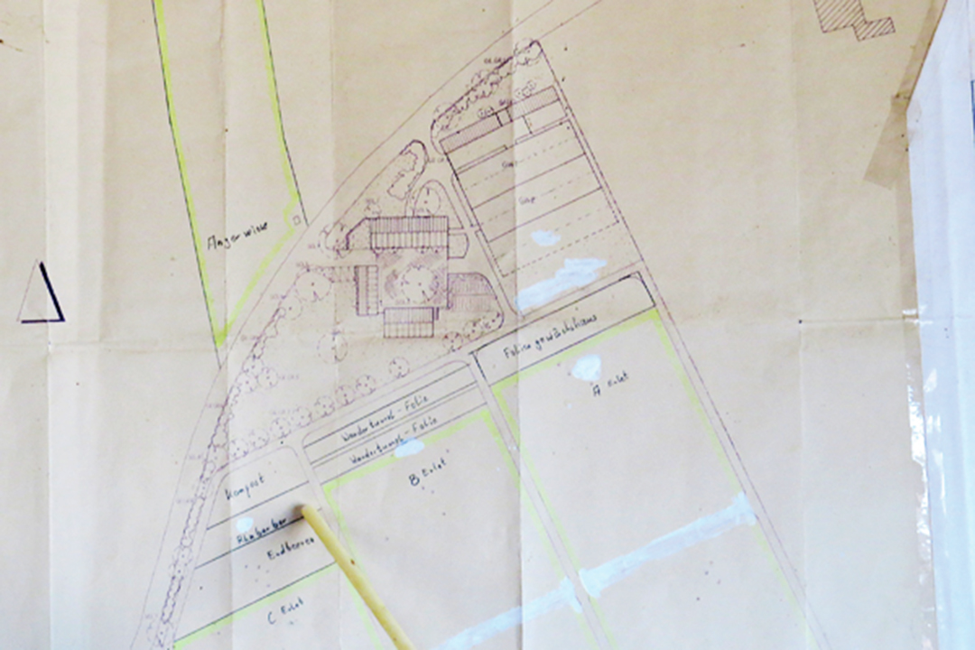 簡單的問候之後,不待我們提問,史特姆開了一瓶啤酒遞過來,然後領著我們走到牆邊,指著牆上已經泛黃的地圖,才開始切入正題。地圖的內容正是他的農場比例縮小圖,邊緣則是各種相關數據,開始解說起來,手指時而游移在農場的不同區位,時而指向邊緣的數據,呈現各種蔬菜及其種植面積,一目了然。農場包括設施、露天兩區,皆為有機耕作;設施栽培面積為三千兩百平方公尺,使用簡單、不需要太多資金的網室,種植綠萵苣、紫萵苣、番茄等蔬菜,以及迷迭香、百里香等香料;露天栽培面積更大,約九公頃,其中四公頃為租用,種植各種蔬菜如菠菜、黑麥、綠肥作物如冬季野豌豆(Winterwicke);分成ABC三區,採取種植「需要多肥分的作物,不需要多肥分的作物,綠肥作物」的三年輪作方式。地圖的清晰呈現,不僅利於規劃,也利於解說。地圖和解說,讓我感到陌生而驚豔!