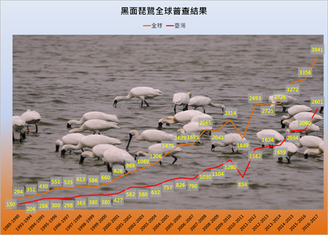 2017年「黑面琵鷺全球普查」已於1月14日及15日進行調查,臺灣普查工作,由行政院農業委員會林務局委託中華民國野鳥學會辦理,透過全國26個鳥會、團體的共同努力,在全臺各地51個樣區與全球同步進行調查,總共紀錄到2,601隻黑面琵鷺,再次創下歷年新高紀錄,比去年紀錄到的2,060隻增加了541隻,為全球增加最多的國家,已連續三年突破二千隻,展現臺灣保育的卓越成效。