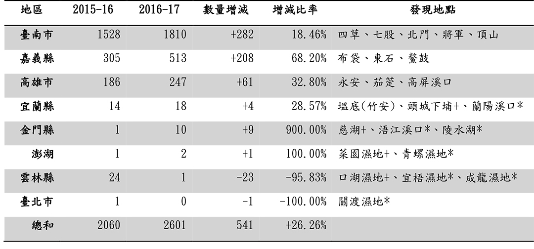黑面琵鷺調查工作,是林務局於2015年透過中華鳥會與全臺(含金門、馬祖)鳥會建立一致性的調查方法,配合全球同步進行,今年進行全國51個樣區調查,動員鳥友超過百人,由中華學會統整臺灣普查資料,送交香港觀鳥會彙整併入國際資料,作為全球黑面琵鷺保育行動成效的重要依據。林務局表示,黑面琵鷺數族群今年集中於西南部沿海濕地,以臺南市的1,810隻數量最多,數量超過200隻的有嘉義縣513隻及高雄市247隻,其中臺南市增加數量更高達282隻,為全臺之冠。今年全球同步普查全球黑面琵鷺增加了585隻,而臺灣的總數增加了541隻,顯見臺灣對於黑面琵鷺保育工作的努力已經見到成效。