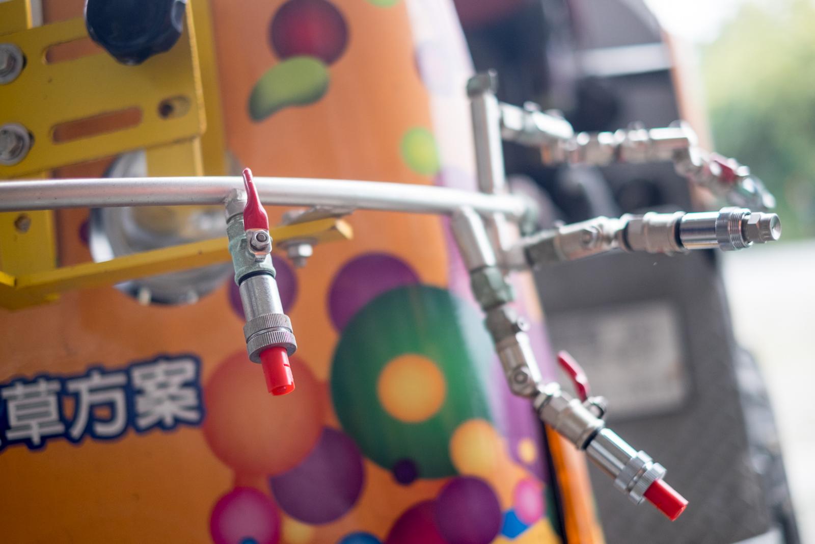 他的農場有各式各樣大小噴頭、長短噴具,閒來沒事就自己DIY組裝,想辦法改良出更有效率的噴藥工具。