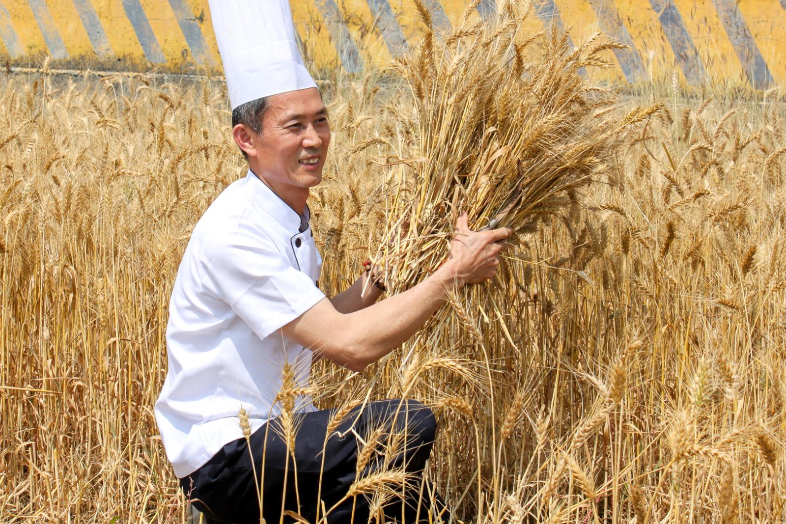世奇精緻餅店總經理蔡永賜穿著廚師袍,開心在田間收割小麥。