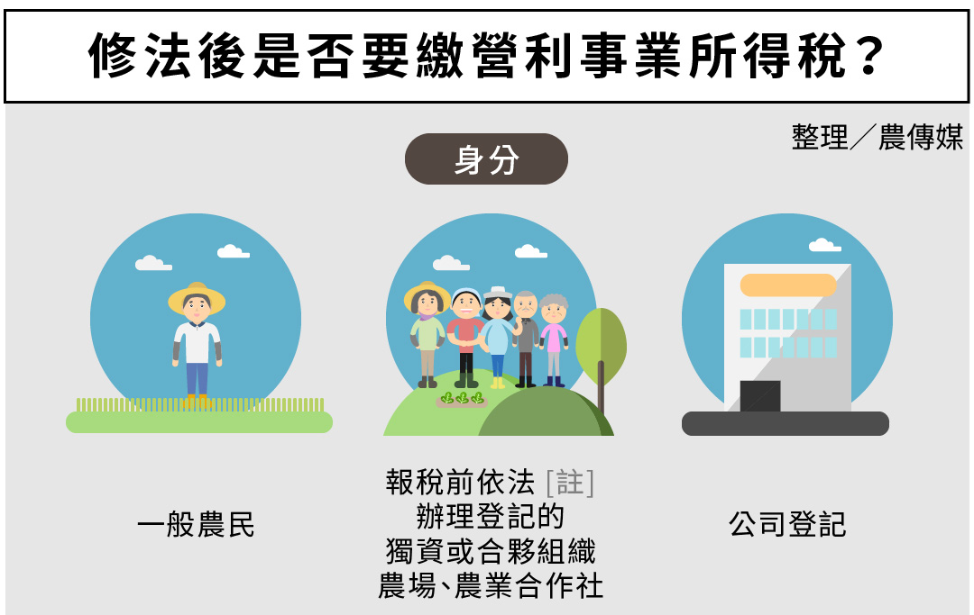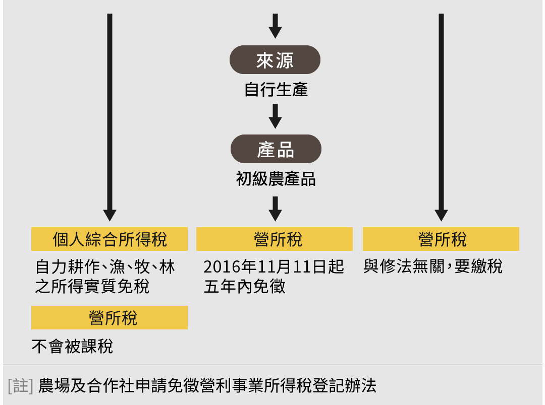 因此,去年11月立法院三讀通過修正《農業發展條例》,未來若符合第47-1條,也就是向主管機關登記的獨資或合夥組織農場、農業合作社,銷售自行生產的初級農產品,在施行期間(2016年11月11日起5年)可享免徵營所稅緩衝期。