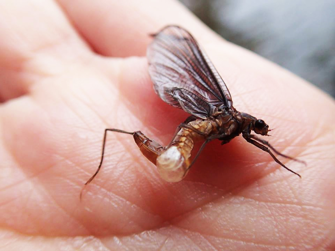 蜉蝣或掙扎或浮漂的屍體,幾乎都在腹部末端發現牠們撐開體節,臆測牠們在夜半清晨未知的時間裡於河流下游某處集體羽化。