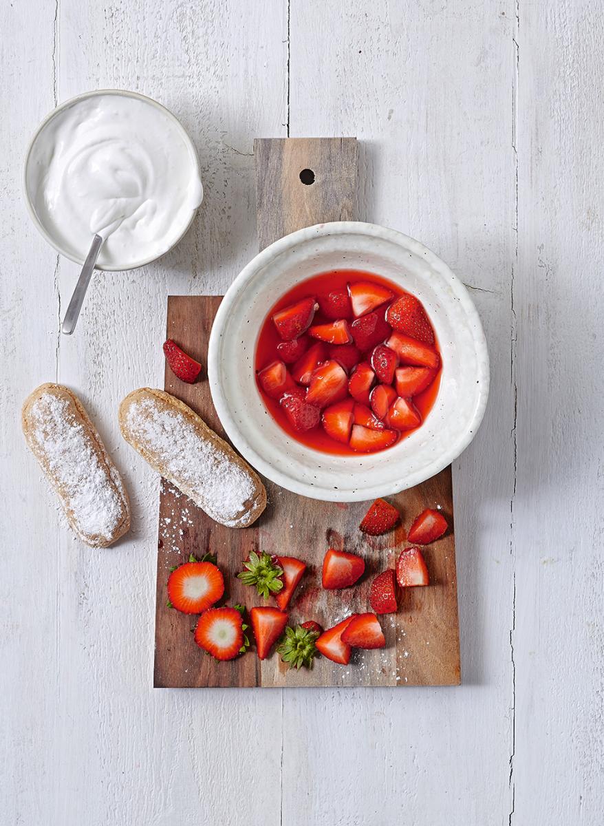 ● 用碗盛裝草莓,搭配香甜酒鮮奶油和手指餅乾一起享用。