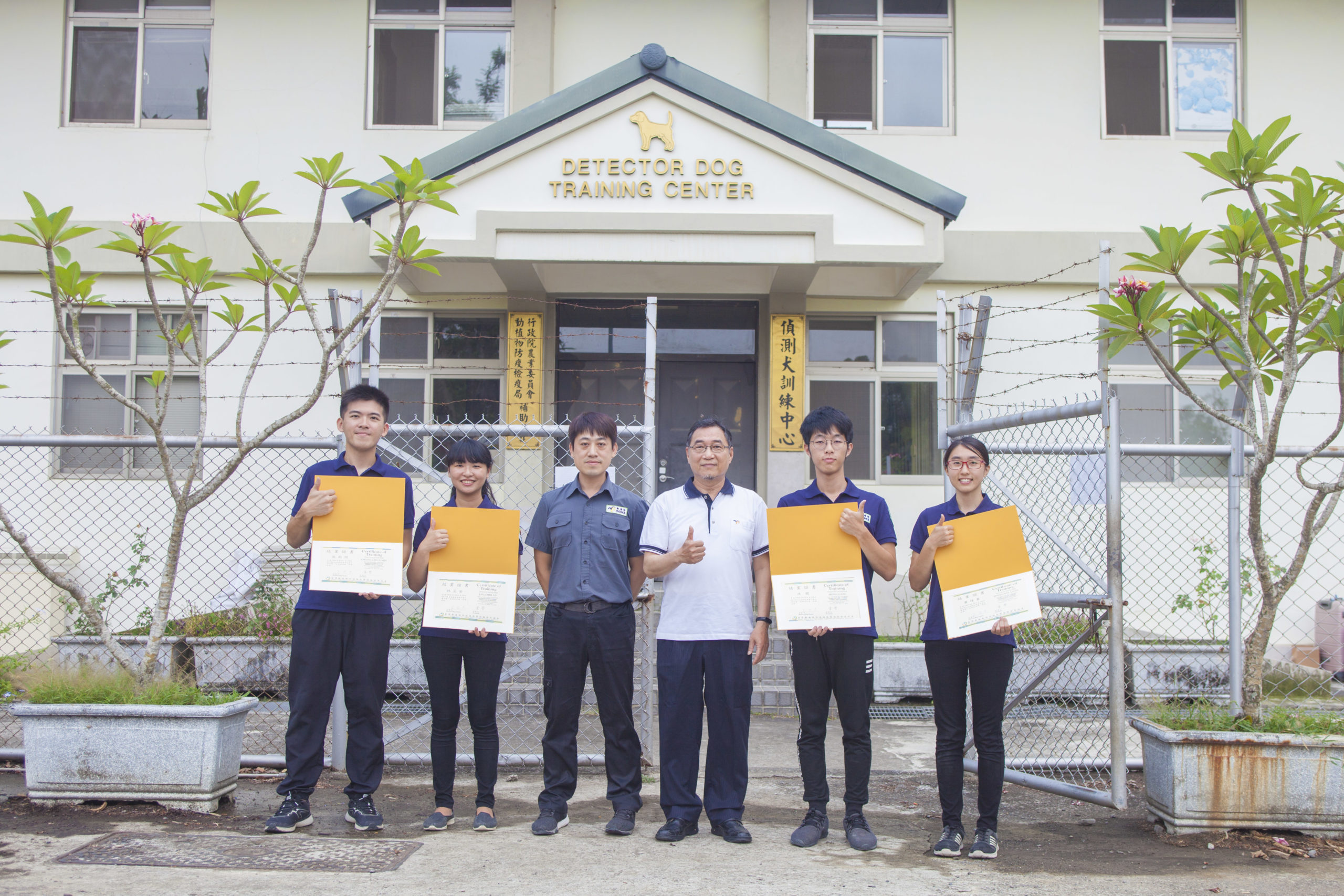 今年5月於屏科大偵測犬訓練中心結訓的領犬員(左起為新結訓領犬員張鈞閔、林芷安、資深訓練師王世宗、臺灣動植物防疫檢疫暨檢驗發展協會副理事長葛文俊及新結訓領犬員洪閬、蕭瑋蓁)。